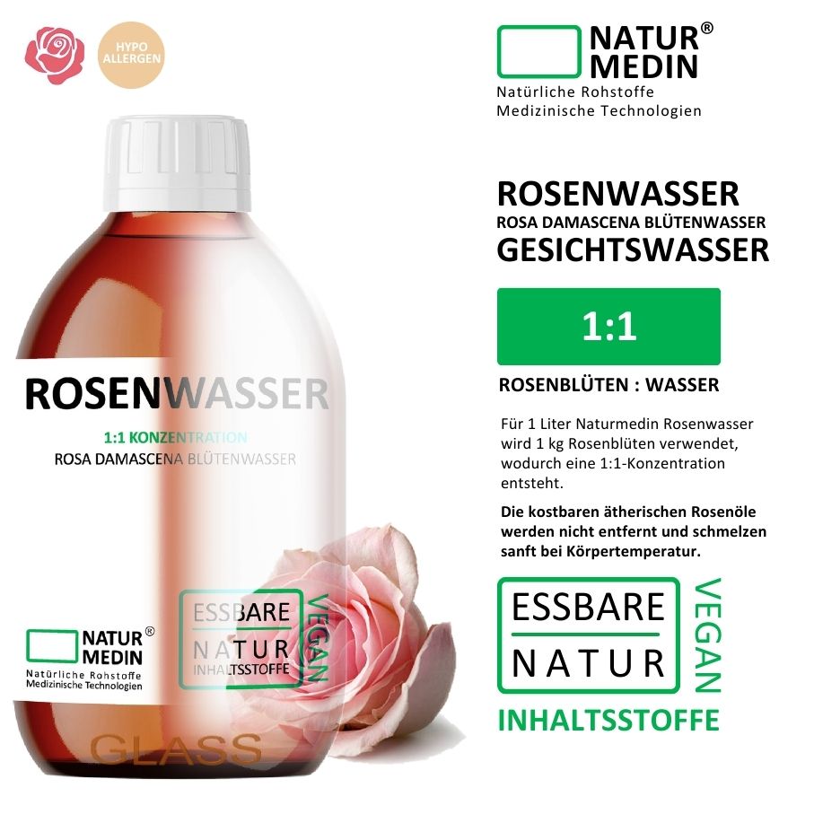 Naturmedin Rosenwasser entsteht aus einem Kilo frischer Rosenblätter pro Liter Hydrolat. Steril hergestellt, frei von Konservierungsstoffen, Sulfaten und synthetischen Zusätzen. So rein, dass es sogar essbar ist.